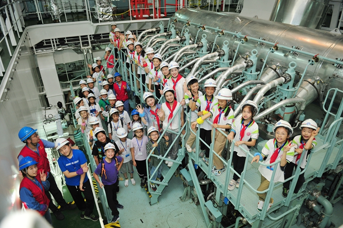 現(xiàn)場觀摩完壯觀的新船吉水儀式,“小小揚船人”對船舶產(chǎn)生了濃厚的興趣。為了讓孩子們更直觀地感受剛看到的這艘龐然大物的威武雄姿,公司安排他們登上建造完工的同型2600TEU集裝箱船參觀。