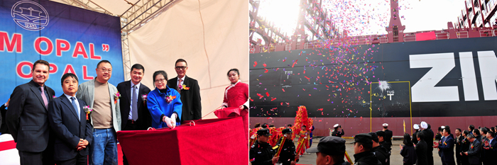 蔡霞女士將新船命名為“ZIM OPAL”輪,為新船砍纜并擲香檳禮,拉響汽笛,祝福新船、隨船船員航行平安,為船東和租家?guī)順s譽(yù)和財富。在“ZIM OPAL”輪首任船長的陪同下,參加儀式的嘉賓興致勃勃地登船參觀。