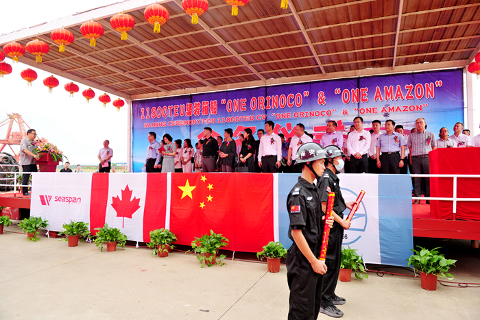 Mr. Li Kun, GlobalSenior Vice President of SEASPAN, Mr. J.J. Meyer, Vice President of AssetManagement Department of SEASPAN, Ms. Zhu Jinglei and Ms. Dong Yufang, both asGodmother, Dr. Tan Weilin, special guest, Mr. Liu Qi, Director of Project InsuranceBusiness Department of Sinosure, Mr. Shi Xingtai, General Manager of LRClassification Society Greater China, Mr. Ji Hongfei, Assistant General Managerof our group, Mr. Yang Xueyan, General Manager of Yangzi Xinfu ShipbuildingCo., Ltd. and other distinguished guests attended the christening ceremony. Ms.Zhu Jinglei named the ship X2270 "ONE ORINOCO", cut the cable andthrew champagne praying for its smooth sailing and full load trip. Ms. DongYufang named the ship X2271 "ONE AMAZON", cut the cable and threwchampagne praying the new ship full cargo and safe return.