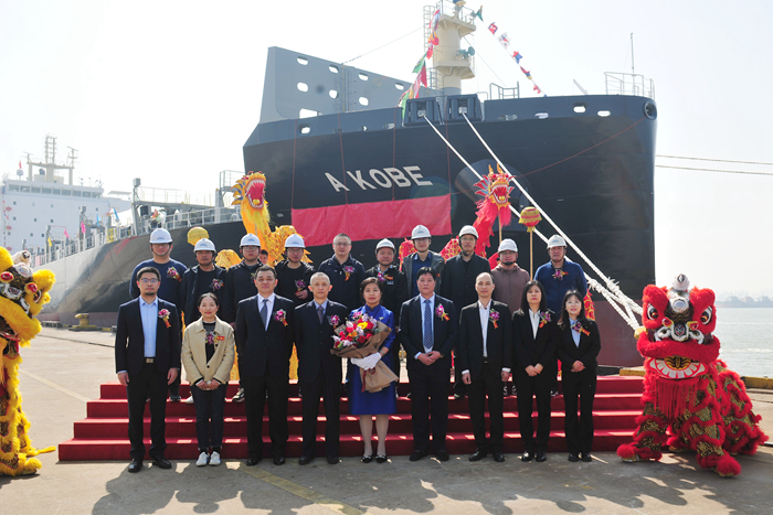 Prior to its departure, Yangzijiang ShipbuildingGroup and Dalian Zhida Ship Management Company jointly held a grand naming andsailing ceremony for the new ship. Ms. Jia Junling named the ship "AKOBE" (Kobe) and performed the traditional ceremony of cutting cables andthrowing champagne to commemorate the occasion.